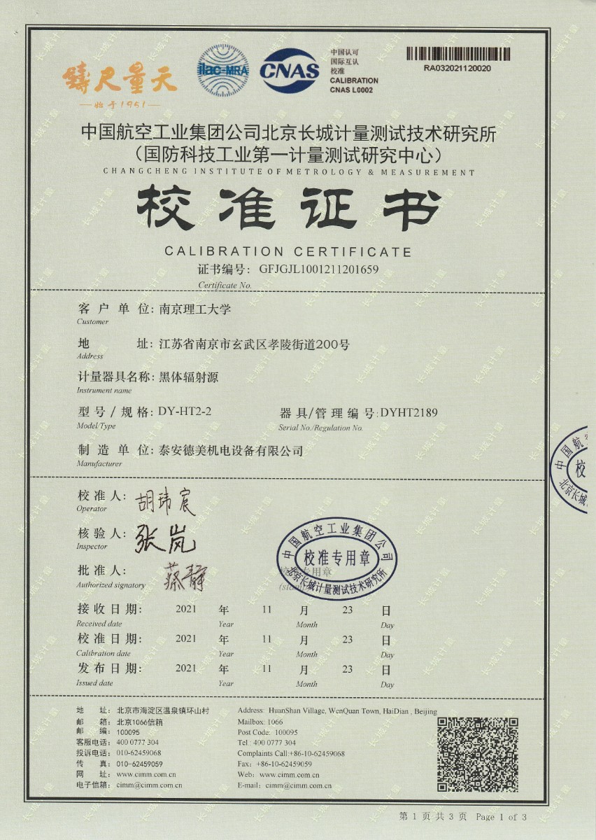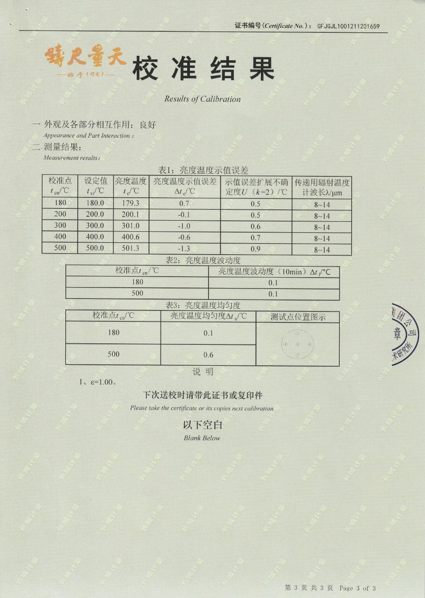南京理工大學-黑體輻射源校準證書180-500℃ 2021-12-4 本文被閱讀 13581 次