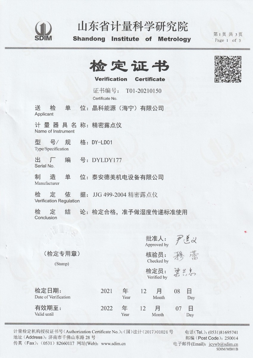 | 上一條:安徽晶科能源有限公司-精密露點(diǎn)儀(溫度) | 下一條:零點(diǎn)恒溫器校準(zhǔn)證書 |