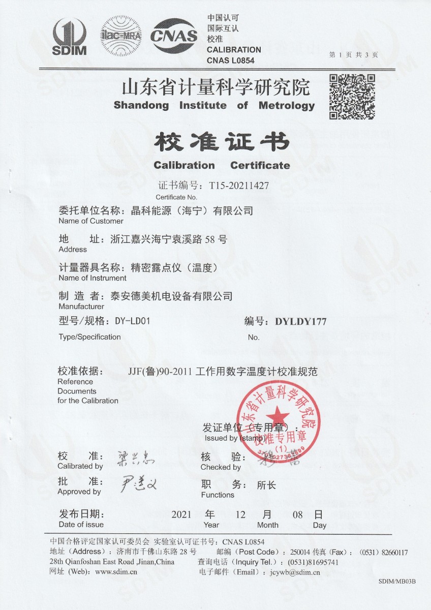 | 上一條:晶科能源(海寧)有限公司-精密露點(diǎn)儀(濕度) | 下一條:溫濕度檢定箱(-5~65℃)校準(zhǔn)證書 |