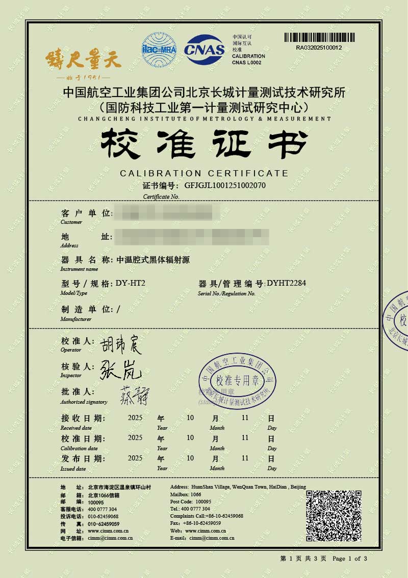 上一條:高溫腔式黑體輻射源(700-1600℃)校準(zhǔn)證書下一條:DY-HT2MF-800大面源黑體爐